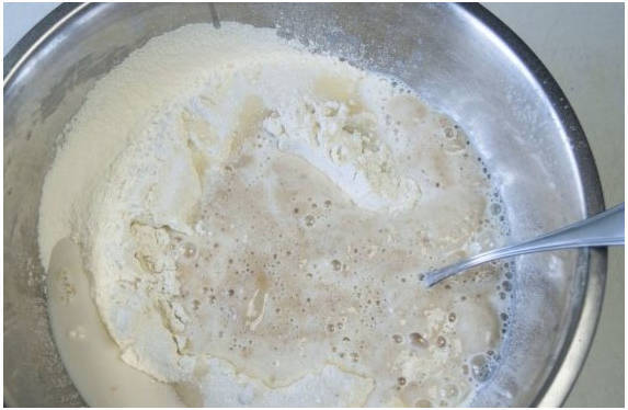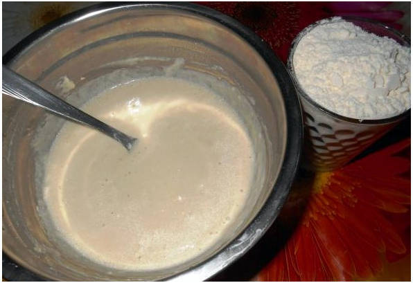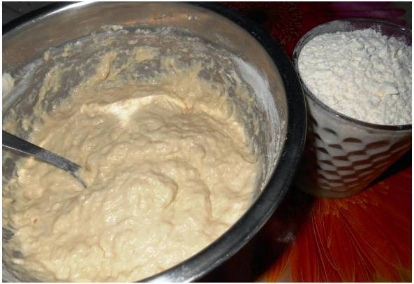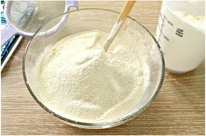 Шаг 4. Постепенно просеиваем в дрожжевую заготовку муку.