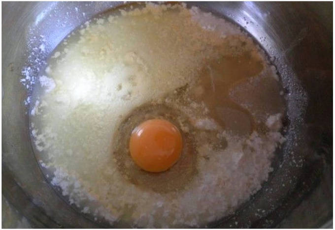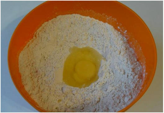 Шаг 2. Делаем в сухой смеси углубление и разбиваем сюда куриное яйцо.