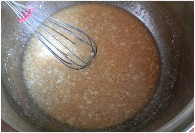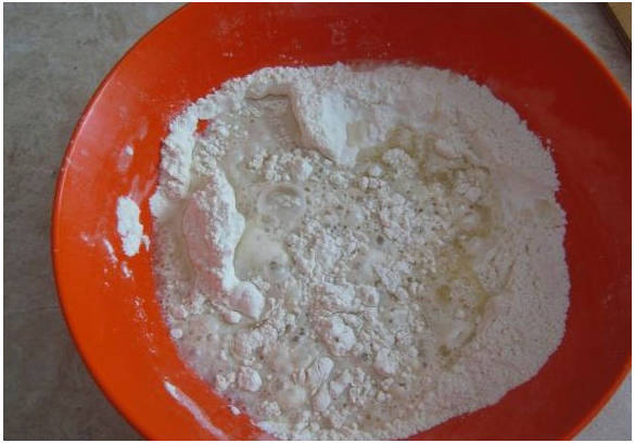 Шаг 4. Выливаем воду с маслом в сухую смесь.