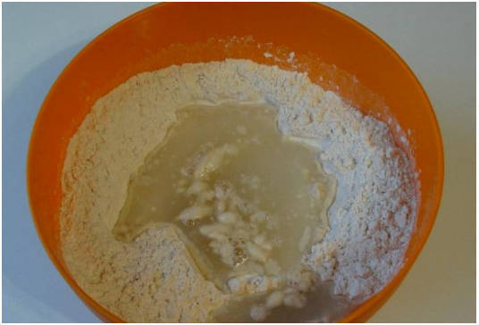 Шаг 4. В муку вливаем воду, перемешанную с оливковым маслом, солью и медом. Если ваш мед не жидкий, то предварительно растопите его в микроволновой печи.