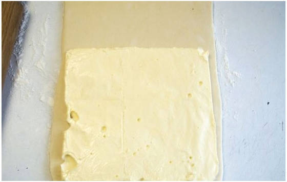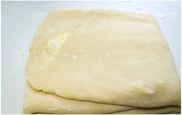 Шаг 10. На половину теста кладем квадрат из сливочного масла. Закрываем его второй половиной.