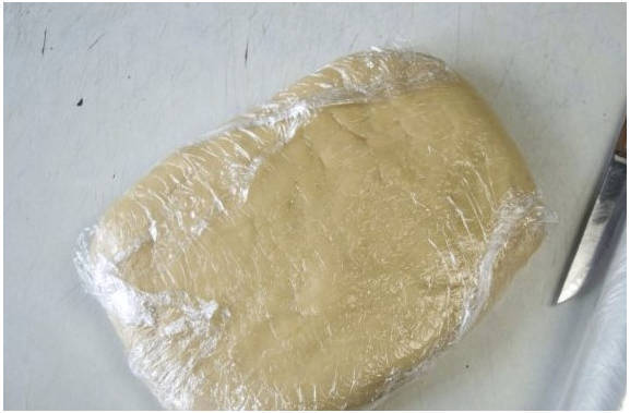 Шаг 6. Разминаем тесто в прямоугольник. Обворачиваем его пищевой пленкой и убираем в холодильник на 4 часа.