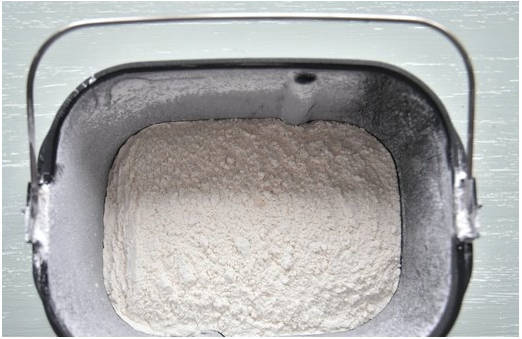 Шаг 2. В контейнер хлебопечки устанавливаем насадку для замеса и высыпаем сюда просеянную муку.