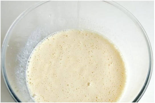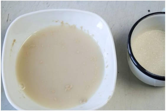Шаг 1. Сперва активируем дрожжи. Для этого немного нагреваем воду, размешиваем в ней сухие дрожжи и чайную ложку сахара (отделяем от общего количества). Оставляем заготовку на 10-15 минут.