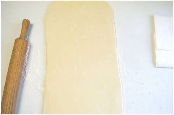 Шаг 9. Охлажденные продукты достаем и даем им оттаять в течение 10 минут. Тесто раскатываем в прямоугольник.