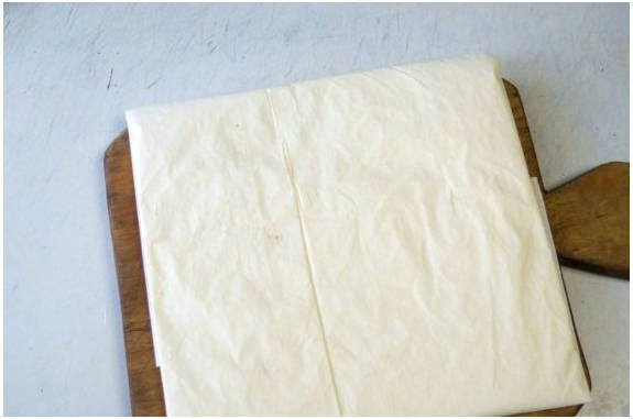 Шаг 8. Заворачиваем пергамент с маслом в квадрат 20х20 см. Раскатываем скалкой, чтобы масло равномерно распределилось по периметру. Убираем в холодильник вместе с тестом.
