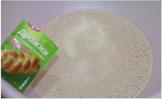 Шаг 1. Просеиваем муку в глубокую миску, добавляем к ней сухие дрожжи.