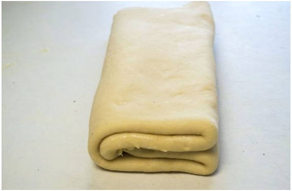 Шаг 12. Дальше ее складываем книжкой. Сперва подворачиваем один край к середине, затем другой. Убираем заготовку в холод на один час.