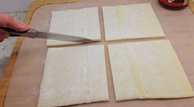 Из слоеного теста можно наряду с повидлом, орехами и шоколадом приготовить круассаны с яблочной начинкой. Выпечка будет несладкой, хрустящей и быстрой. Тесто для этой выпечки возьмите не дрожжевое, а пресное.