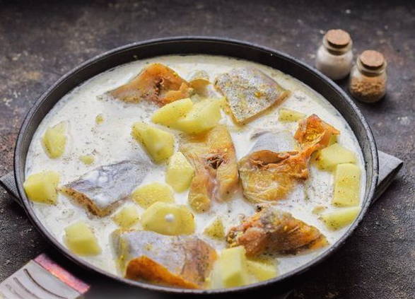 Минтай в сметане с картошкой на сковороде
